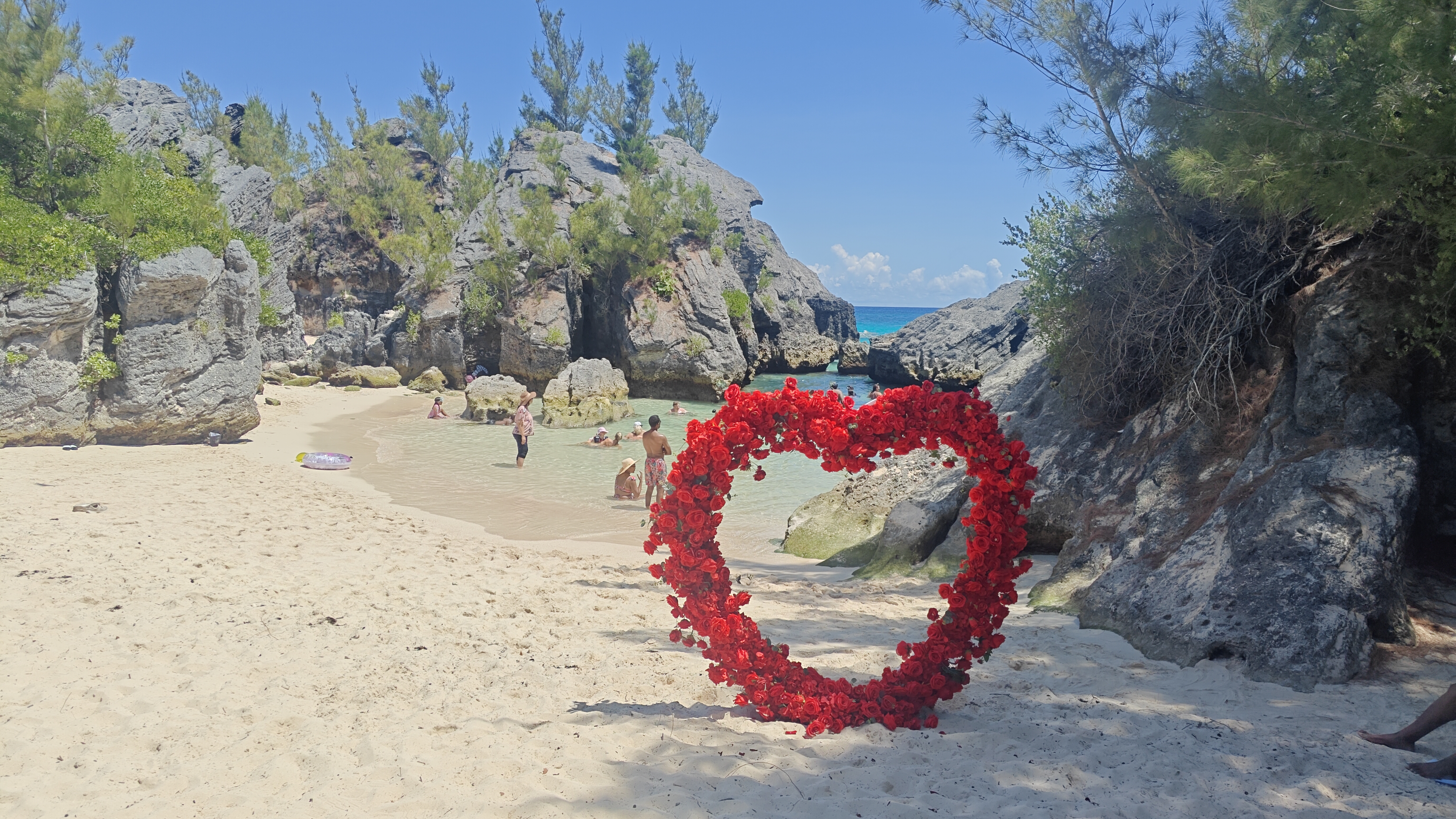 We skipped the Instagram-flooded Horseshoe Bay (thanks to Darrel’s insider intel of it being overcrowded!) and headed to a more secluded beach nearby. And what a choice that turned out to be! Powdery pink sand caressed by clear turquoise water, gentle waves that beckoned instead of bullied, and—most intriguingly—a giant heart-shaped installation of roses left behind from what looked like a beach wedding. Darrel, never missing a beat, winked and said, “That’s either love… or excellent marketing.”