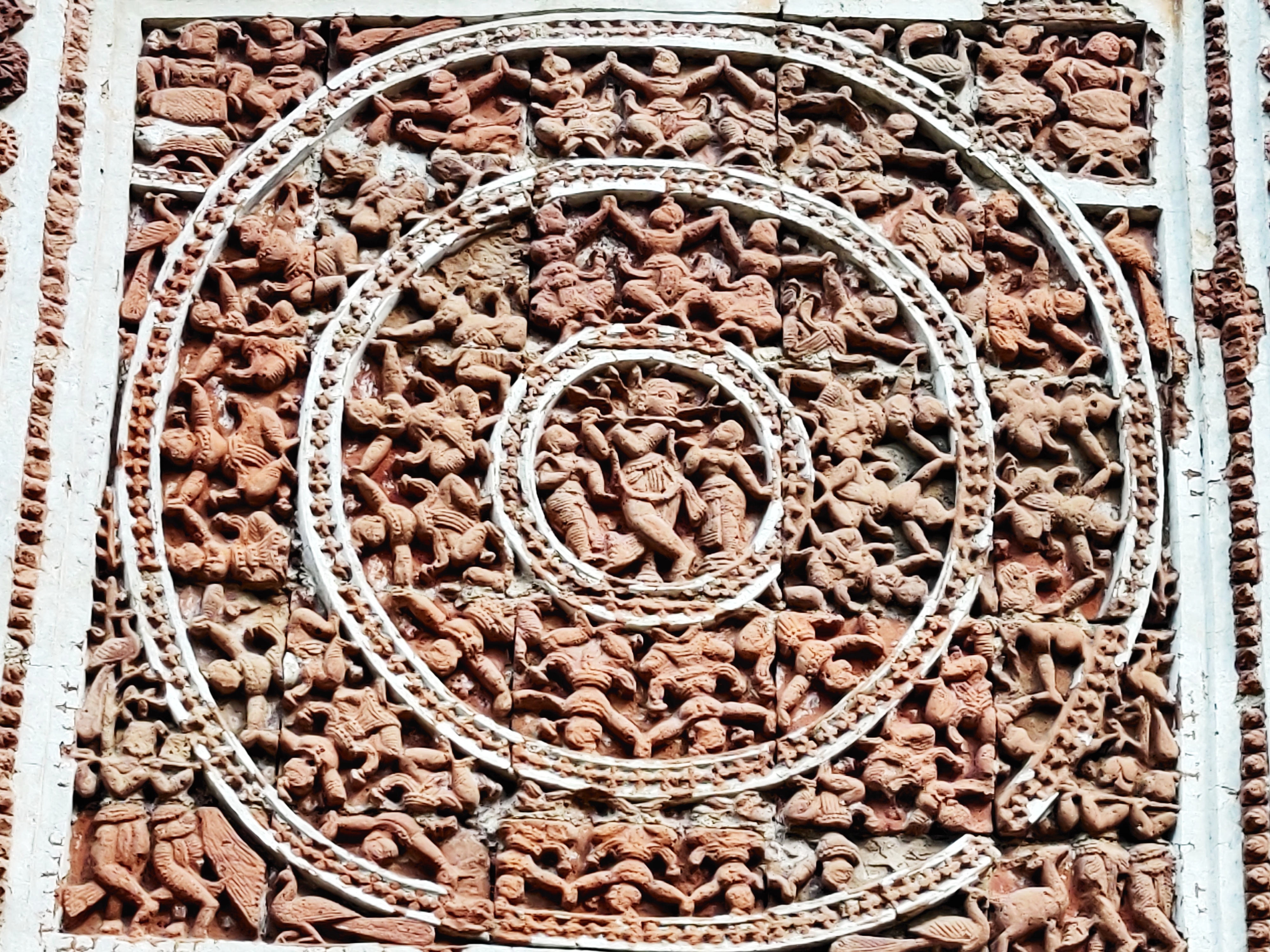 Which brings me to the Terracotta temples and the associated art form which the Malla rulers took to mesmerizing heights. The intricately chiselled terracotta panels stand out, depicting as they do, mostly incidents from Krishna and Radha’s liason, but to a lesser extent, important scenes from the Hindu epics Mahabharat and Ramayana.